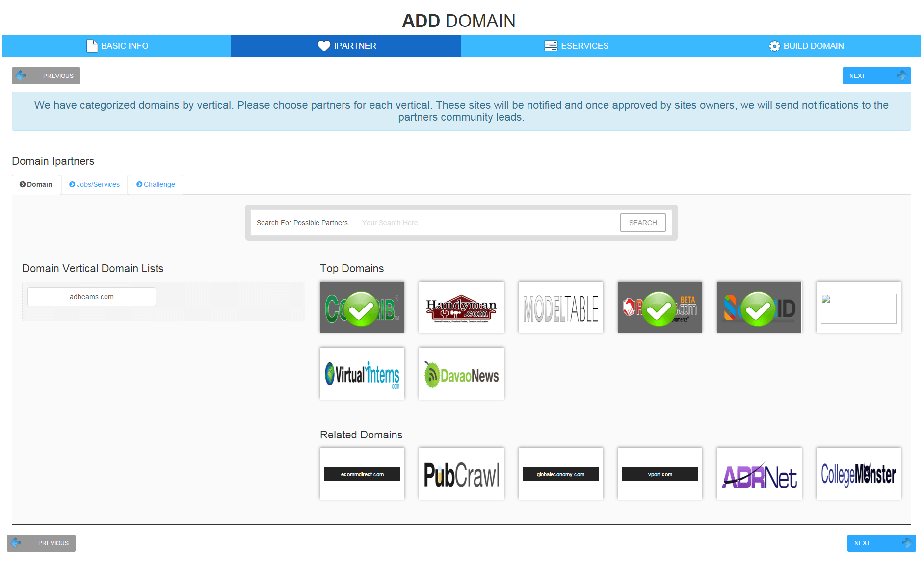 Domains are categorized by vertical. Choose partners for each vertical and these sites will be notified once approved.