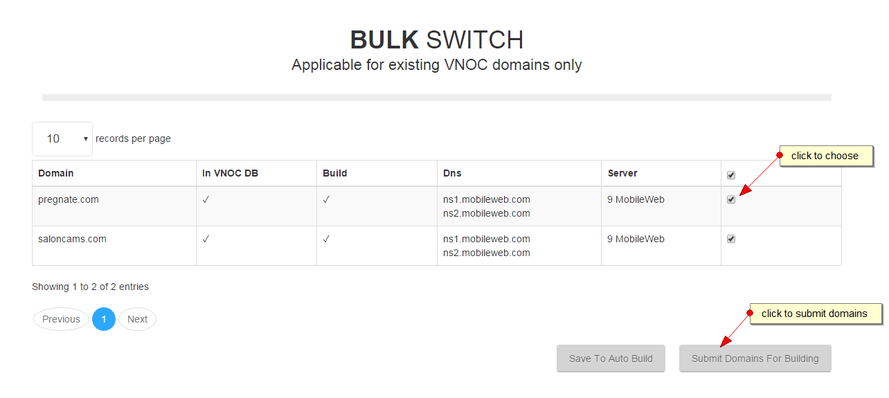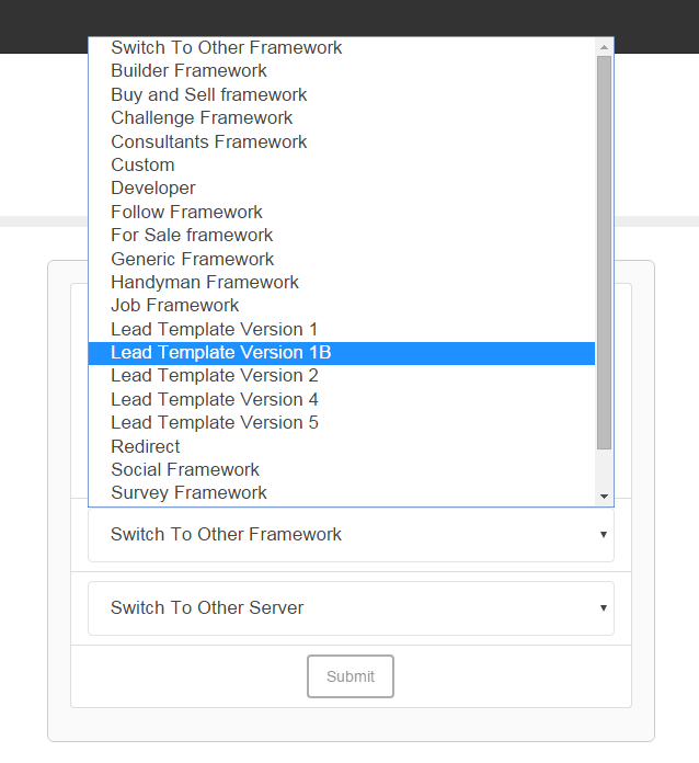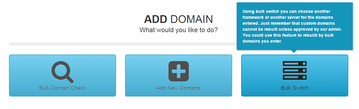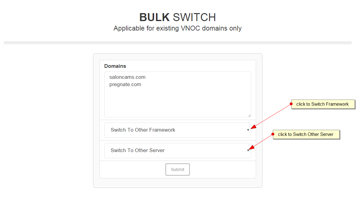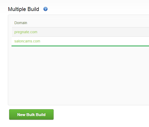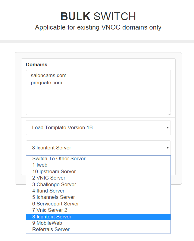 From Main Dashboard click “Add New Domain“ Bulk Switch Input domains in the text area then choose switch “Framework” and “To Other Server”. Hit Submit when done. Switch to Other Framework Switch to Other Server Submit Domains for Building Will open New Tab: Multiple Build Out on Contrib.com Success