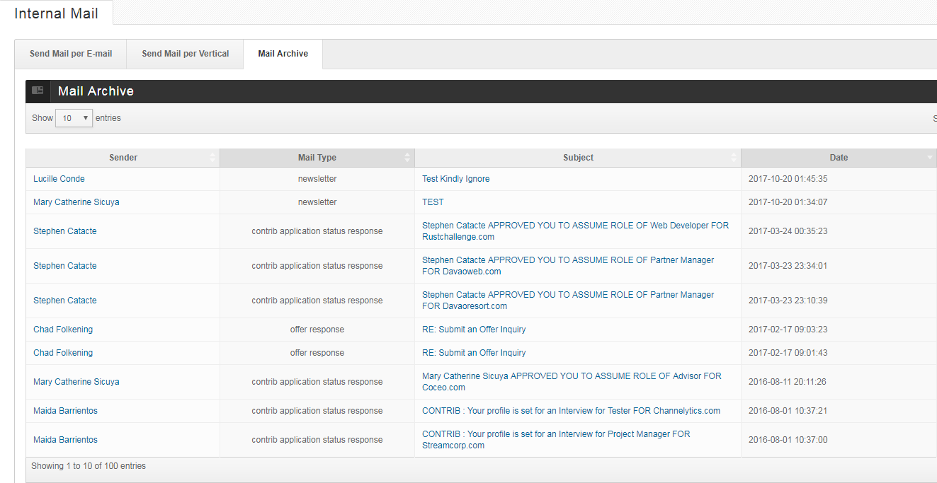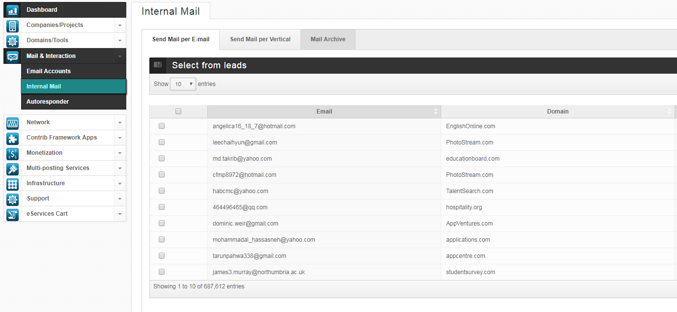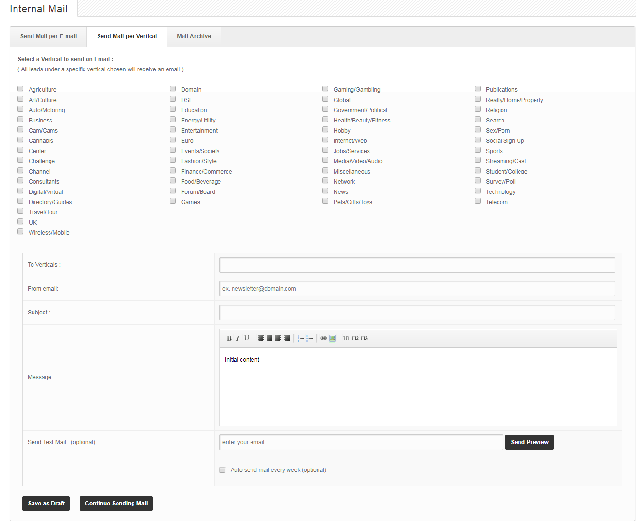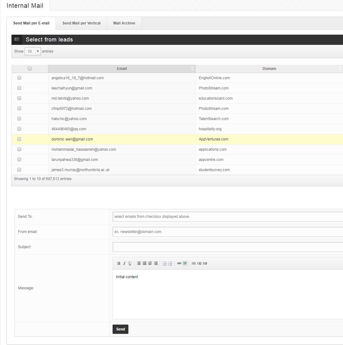 Internal mail features allow the user to send an email to one individual, a whole vertical or a couple of leads. Send mail per email – select from leads. Send mail per vertical Select a Vertical to send an Email . All leads under a specific vertical chosen will receive an email. Mail Archive